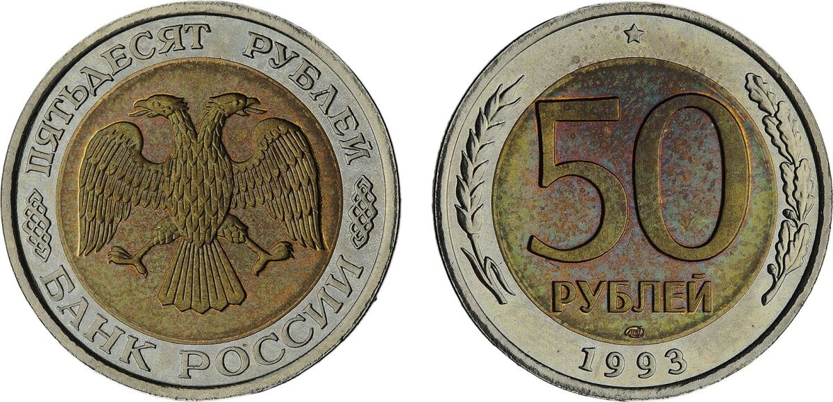 Первая часть данной темы нашла положительный отклик у читателей канала. Статья, посвященная ей, стала одной из самых популярных в блоге. В этой публикации мы продолжим разбор редких монет ельцинского периода, возникших в результате технологических ошибок, рассмотрим их основные особенности и актуальный ценник. 50 рублей 1993 ЛМД биметалл Наверное, одна из самых известных и удивительных по своему происхождению монет ельцинской эпохи. К началу 1993 г. был сформирован план выпуска денежных знаков, соответствовавший дизайну предыдущего года. Была подготовлена партия биметаллических монетных заготовок (с латунной и медно-никелевой вставками) и штемпельных пар для их эмиссии. Однако стремительная инфляция и дороговизна производства вынудили изменить решение и чеканить более дешёвую в производстве 50-рублевку из латуни. Возможно, редкая монета не появилась на свет, если бы не годовые наборы 1992 г. для коллекционеров. При их формирования, по всей видимости, был израсходован запас 50-рублевых