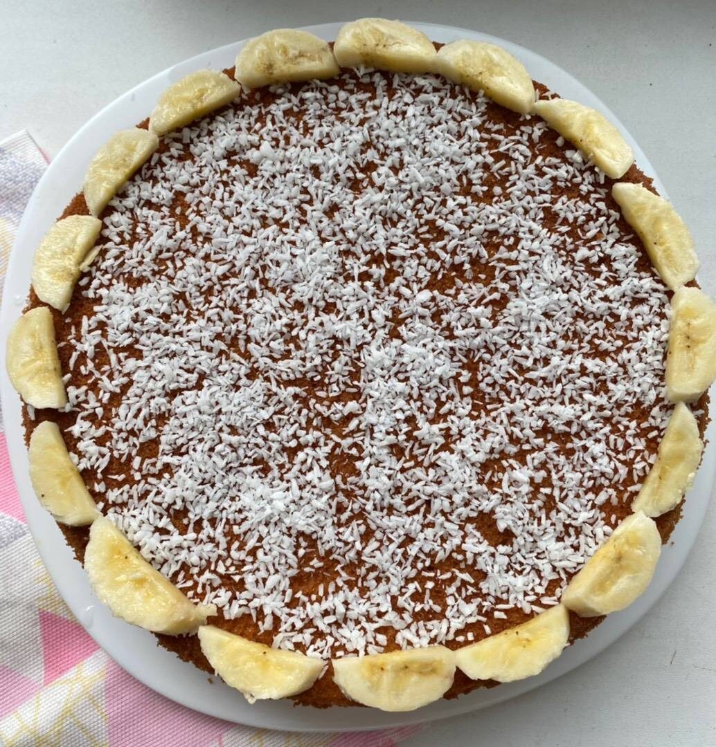 Ингредиенты: муки, кефира, манки, яйца, сахара, кокосовой стружки, разрыхлитель, подсолнечного масла Способ приготовления: Взбиваем сахар с яйцами. Вливаем к ним кефир, тонкой струйкой всыплем манку. Перемешать до однородности. Добавить масло. Перемешать. Добавить муку и разрыхлитель. Перемешать. (Муку добавлять обязательно после масла) Добавить кокосовую стружку. Перемешать. Форму с тестом ставим на 180° 40 минут, до румяной корочки. Сироп(по желанию): варим воду с сахаром до закипания, можно добавить сок лимона. Остужаем. Поливаем сиропом готовый кекс.