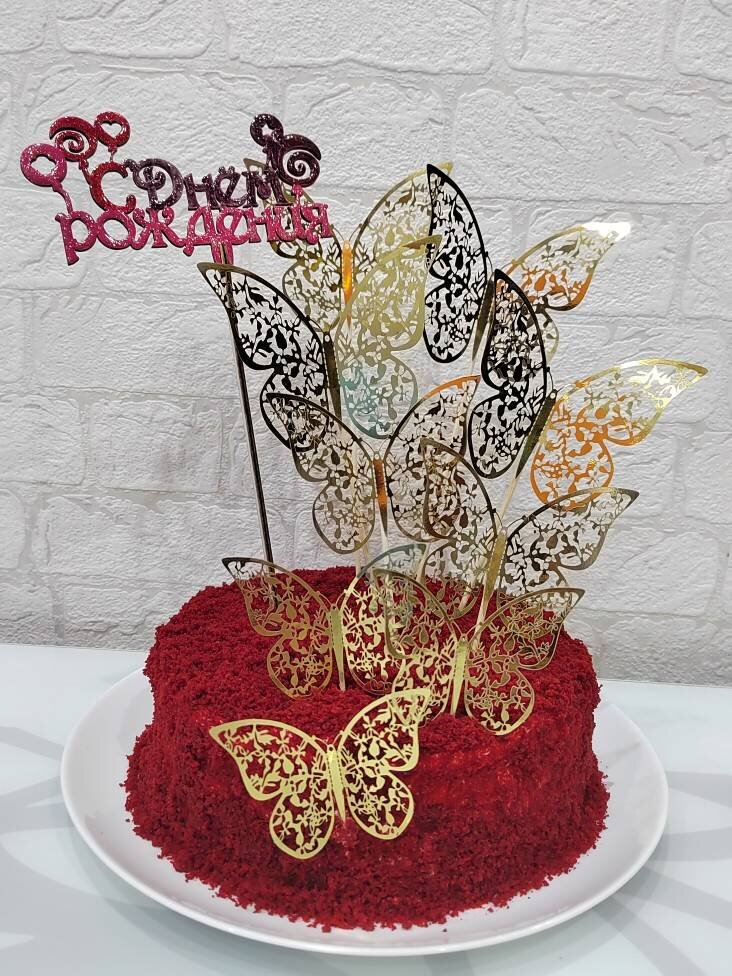 #красныйбархат #торт #выпечка #десерт #деньрождения Ингредиенты: Тесто:, муки, сахара, какао, соли, разрыхлителя, соды, яйца (комнатной температуры), подсолнечного масла, кефира 3,2%, сливок 33%, красного гелевого красителя, Крем:, сливочного масла (размягчённое, вытащить за 4 часа), сахарной пудры, сливочного сыра "Филадельфия" - ХОЛОДНЫЙ, Декор:, Топер с Днём рождения, Акриловые бабочки Способ приготовления: Все сухие ингредиенты просеиваем 2 раза. Сначала муку, затем какао, соль, разрыхлитель и соду. Добавляем сахар, сливки, кефир, подсолнечное масло, 3 яйца и краситель (на фото самый удачный цвет для торта). Взбиваем всё на средней скорости 4-5 минут. Даём тесту постоять минут 5. Берём форму d=20 см, с разъёмными боками, застилаем дно пергаментной бумагой. Смазываем бока и дно (чуть-чуть). Делим тесто на 2 части (равные), примерно каждая часть по 650-700 гр. 1 часть выливаем в форму и отправляем в разогретую духовку до 170-180°С на 40-45 минут, вторую часть теста оставляем на столе