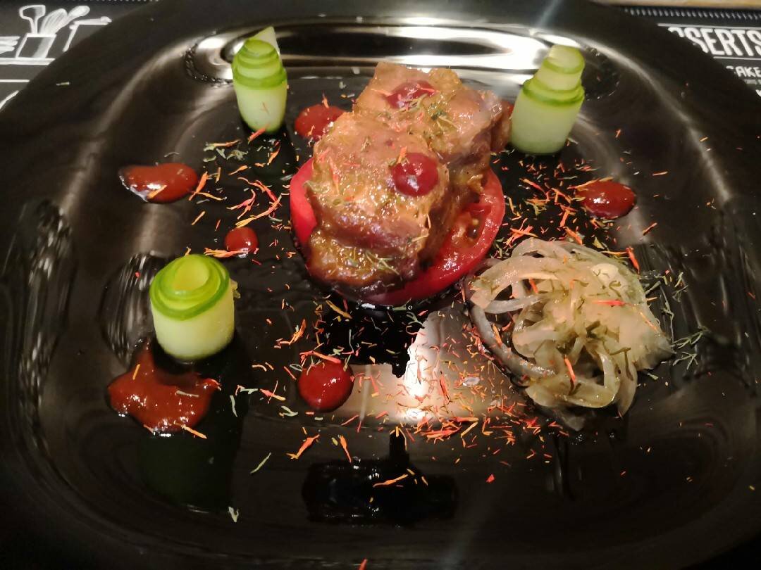 Ингредиенты: Шея свинины, Домашний Ткемали, Куркума, Болгарский перец молотый, Смесь острых перцев, Томат сушёный красный, Соус соевый, Перец чёрный молотый, Лук репчатый, Уксус бальзамический винный, Сахар, Соль, Укроп сушёный, Вода, Огурец, Шафран, Горчица дижонская, Мёд Способ приготовления: Маринуем шею (специи: паприка, куркума, смесь острых перцев, соевый соус (живой без Е), перец чёрный молотый, томат сушёный)). И холодильник и на ночь. С утра вынимаем даём прогреться до комнатной температуре. Растапливаем ложку мёда на водяной бане. Размешиваем и даём настояться у меня заняло часов 10 из-за лени). Отправляем в духовку на 180 град. на час. Готовим маринованный лук (лук, уксус столовая ложка, сахар столовая, соль чайная, укроп сушёный), на огонь, закипело, выключили, охладили, дали настояться). Сервируем тарелку и приятного аппетита от Александра. 😉