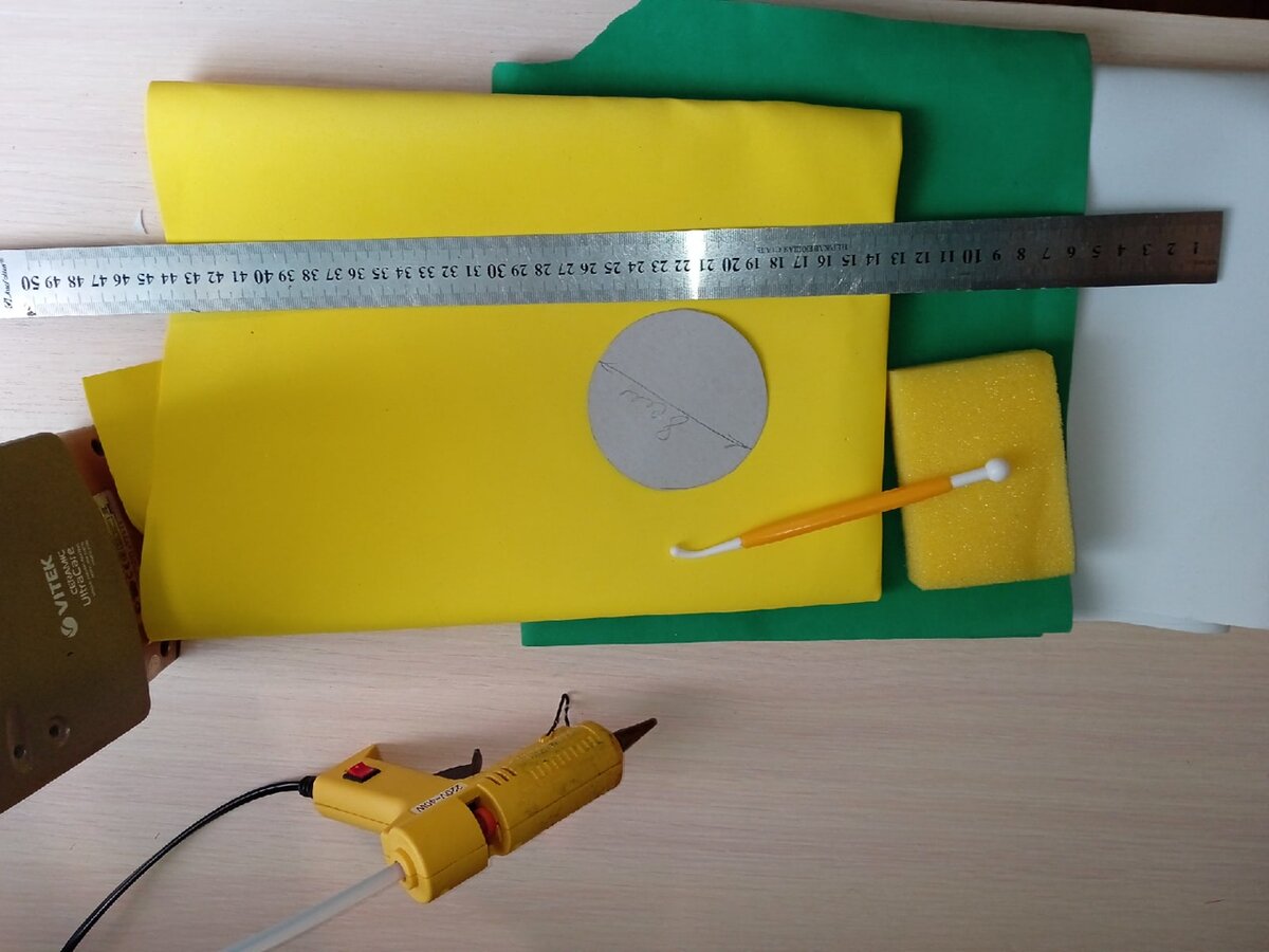 - Фоамиран трех цветов - белый, желтый, зеленый. Можно использовать Иранский, но у меня Китайский, и из него получается ни чуть не хуже.