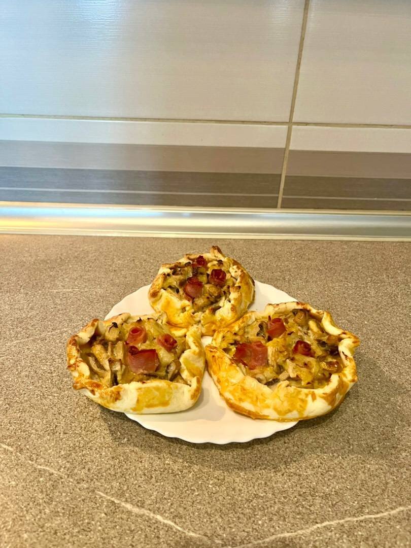 Ингредиенты: - Мука, - Соль, - Сливочное масло, - Холодная вода, - Грибы, - Сахар, - Сметана, -Бекон, - Лук Способ приготовления: Делаем тесто, смешиваем муку со сливочным маслом, добавляем соль и холодную воду, сформировали шар и убрали в холодильник на 20 минут. Делаем начинку. На сковороде растапливаем немного сливочного масла, выкладываем лук, обжариваем две минуты и добавляем сахар, тушим минуты три. Дальше выкладываем грибы, жарим, добавляем сметану, соль, все хорошо перемешиваем, начинка готова. Достаём тесто, раскатываем в круги. В центр раскладываем начинку и заворачиваем края. Сверху выкладываем бекон. Смазываем яичным желтком галеты и ставим в разогретую духовку до 180 гр. на 15-20 минут. ПРИЯТНОГО АППЕТИТА!!!