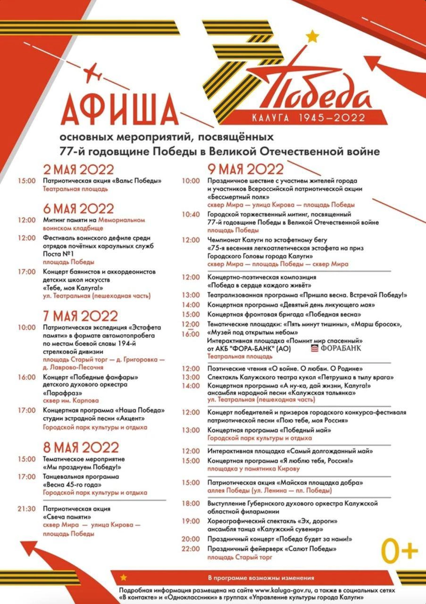 Делимся афишами праздничных мероприятий в Калуге и Обнинске в честь 77-й годовщины Победы в Великой Отечественной войне.