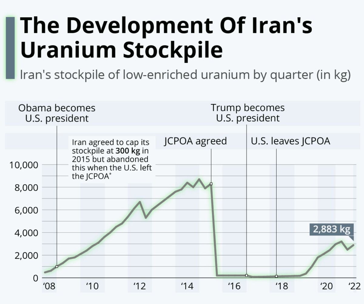 Всем привет👋 Сегодня разберем картинку о запасах урана в Иране! Администрация Байдена потратила год, пытаясь возродить значимаю ядерную сделку с Ираном, согласованную в 2015 году при президенте Бараке Обаме и расторгнутую в 2018 году во время президентства Дональда Трампа. Теперь переговоры снова сорваны - на этот раз из-за требований России. Новые запросы, которые были названы "неуместными", поступают в то время, когда США, как сообщается, хотели бы использовать Иран для поставок нефти после введения эмбарго на поставки России из-за вторжения в Украину. Однако для этого ядерная сделка должна была бы вернуться на стол переговоров. После того, как в 2018 году был отменен лимит запасов иранского урана в 300 кг, согласованный в соглашении по СВПД, Международное агентство по атомной энергии (МАГАТЭ) сообщило о значительном росте запасов ядерного материала в Иране. Несмотря на то, что Тегеран настаивает на том, что его ядерная программа преследует исключительно мирные цели, уровни обогащен
