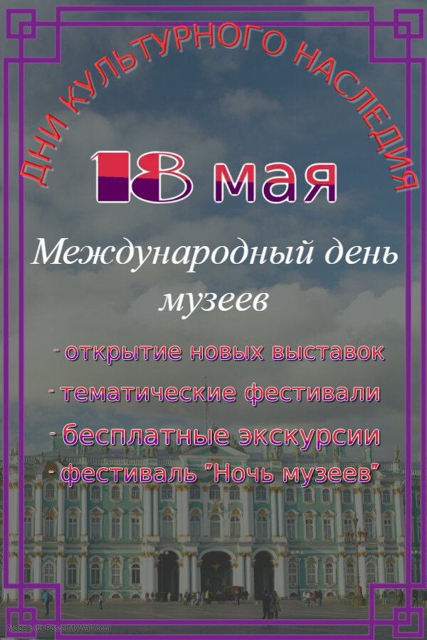 Аннотация: Данный плакат информирует людей о предстоящих мероприятиях, посвященных Международному дню музеев, который состоится 18 мая. Плакат выполнен с помощью онлайн-редактора PosterMyWall. Ф.И.О.: Клычева Анастасия Алексеевна Школа: МБОУ СОШ №15 Класс: 9 Номинация: "Картинная галерея".