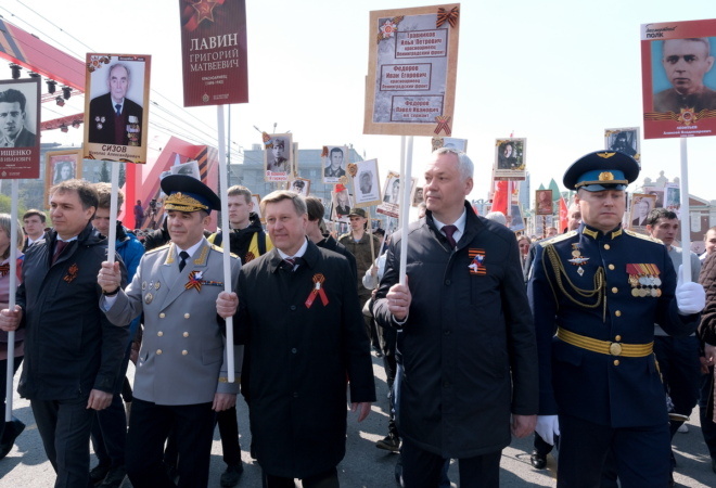 В центре Новосибирска состоялось шествие «Бессмертный полк». В голове колонны прошли губернатор Новосибирской области Андрей Травников, спикер Законодательного собрания НСО Андрей Шимкив, мэр Новосибирска Анатолий Локоть и другие представители власти. Ранее губернатор Новосибирской области Андрей Травников рассказывал, что в его семье три участника Великой Отечественной Войны: два деда и дядя, однако их фотографии не сохранились, поэтому он нес табличку, на которой указаны их имена и названия воинских частей, в которых они воевали. А у мэра Новосибирска в Великой Отечественной Войне участвовал дед: он пропал без вести в боях за Ленинград. Фотографии Сергея Завражных