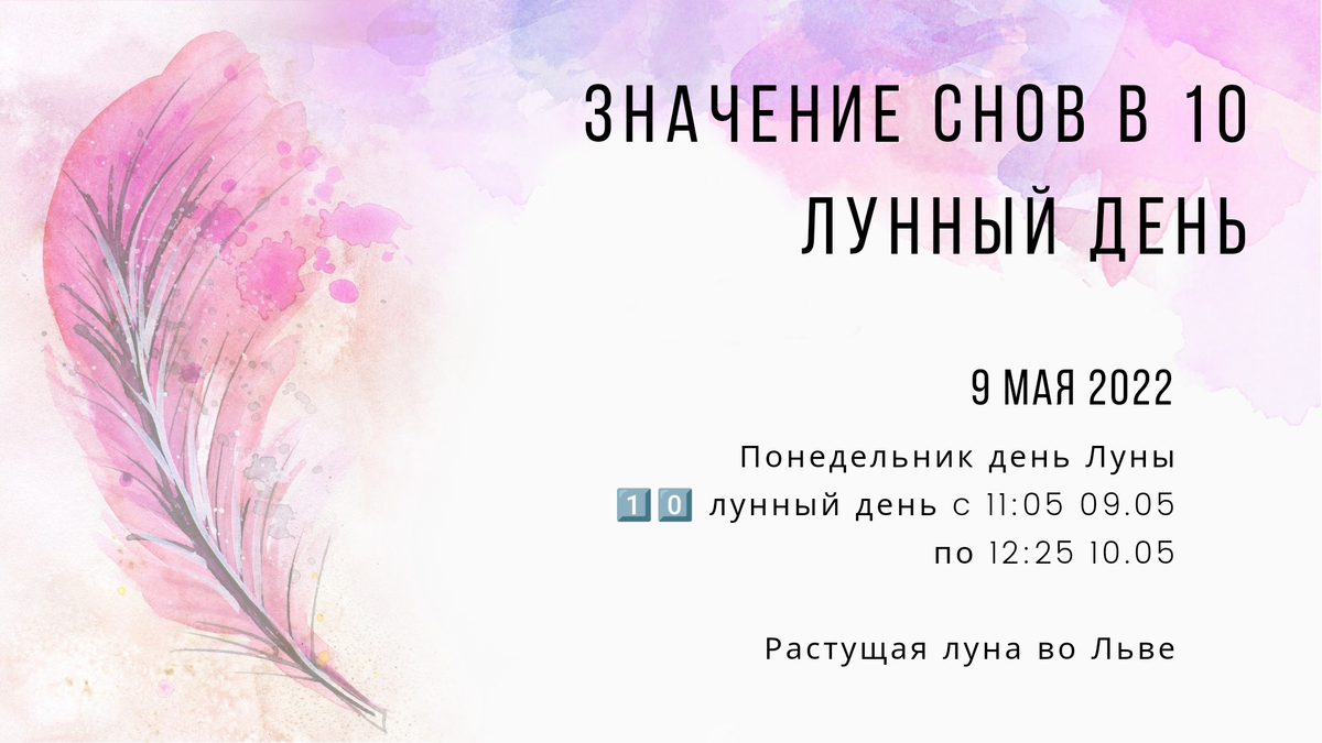🌓 9 мая 2022 Понедельник день Луны 1️⃣0️⃣ лунный день c 11:05 09.05 по 12:25 10.05 Растущая луна во Льве Сны следующей ночи могут принести приятные переживания, поэтому ложись спать пораньше. Десятые лунные сутки, как известно, связаны с родом и семьей, и сон также отражает этот принцип. Поэтому во сне ты можешь увидеть родственников или супруга (супругу), детей, и даже прародителей всего рода, в том числе и духовных. Если во сне тебе явились сильные рода, или Дух-Хранитель рода будь внимательны к тому, что ими говорится, или что происходит, так как через это ты можешь прийти к какому-либо для себя пониманию, открытию. Может тебе будет оказана какая-то поддержка рода или будут переданы знания рода, если ты готова. Также сны в эти лунные сутки могут быть достаточно легкие, яркие и сказочные, но они, как правило, не имеют значения. Тревожные сны надо осознать и либо с ночью отпустить их, либо поработать с ними, чтобы в жизни они не настигли тебя, заставив наступить на грабли. Если же т