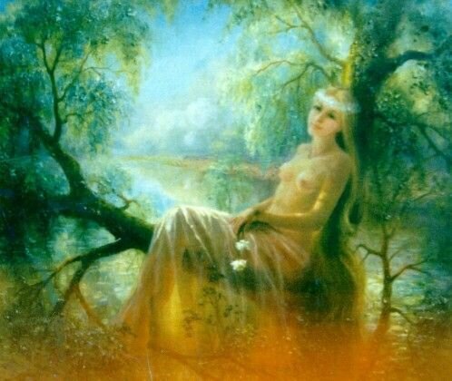 Река была спокойна. Казалось, она спала, лишь тихо вздымалась ее могучая грудь. Ясно светила полная луна, кидая на воду серебряную прозрачную дорожку, и от этого Волга казалась загадочной. На берегу реки росли редкие деревья. Их длинные ветки тянулись далеко над рекой, а некоторые опускались почти до воды . Влад заметил на толстой ветке дерева девичью фигуру и обомлел.<Вроде все девчата спят,>-вспомнил он. Паренек пригляделся и явно увидел тонкий девичий стан и длинные, отливающие серебром, волосы. Влад пытался рассмотреть издали лицо девушки, но тщетно, слишком было далеко. Паренек сразу понял, что это, не кто иной, как русалка,но не поверил такой удаче. Он подбирался по кустам, чтобы не спугнуть диковину. Вот она уже рядом. Ясно видны очертание лица, гибкого тела, человеческие руки и рыбий большой хвост, сияющий серебристой чешуей. Как не пытался молодой человек разглядеть ее лица так ничего и не получилось.<Как она хоть выглядит? Одни, говорят, красивые особи, другие ученые утверждают,что они отдаленно напоминают людей, у них большая рыбья голова.> Он еще раз глянул из кустов на диковину и убедился, что голова человечья. Он почти не дышал, боясь, что спугнет это чудо.Вдруг раздался не то вздох, не то слабый стон,и сразу следом полилась песня, от которой у Влада замерло сердце. Голос был так чудесен, что молодой человек забыл обо всем на свете. Он неожиданно вышел из кустов и направился к русалке. Девушка обернулась на шорох, и Влад увидел синие, как небо, глаза. Песня оборвалась.Русалочка ойкнула и,сделав удивительной красоты сальдо, прыгнула в воду. Сколько он стоял времени не знал, никак не мог опомниться. Очнулся только тогда,когда мелькнул первый луч солнца и прошелся теплом по лицу молодого человека. Влад еще долго стоял на берегу и все смотрел на воду, надеясь еще раз услышать дивную завораживающую песню.Но сколько он не вглядывался в речку ничего не напоминало о прекрасной и таинственной деве. Нехотя, Влад пошел назад к ребятам. Костер потух и только кое-где виднелись горящие угольки.