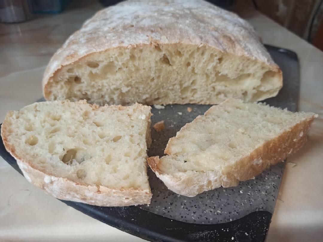 Простейший рецепт хлеба!!! Вкусный, араматеый и воздушный хлеб, который даже не нужно высушивать...👍🤤 Ингредиенты: вода, дрожжи сухие, соль, сахар, мука Способ приготовления: В теплую воду добавить соль, сахар, дрожжи, дать постоять в теплом месте минут 15. Чтоб появилась пена. Спустя время, добавить частями просеяную муку. Всё хорошо перемешать ложкой или лопаткой. Тесто будет очень липкое, так и должно быть. Накрыть полотенцем или пищевой плёнкой и оставить в теплом месте на 1.5 часа. Противень застелаем пекарской бумагой, присыпаем слегка мукой. Тесто не обминаем, а аккуратно выкладываем на противень. Слегка придаем форму овала и присыпаем немного сверху мукой. Ставим в разогретую духовку до 180°, выпекаем до золотистой корочки, минут 30-40. ПРИЯТНОГО АППЕТИТА ❤️