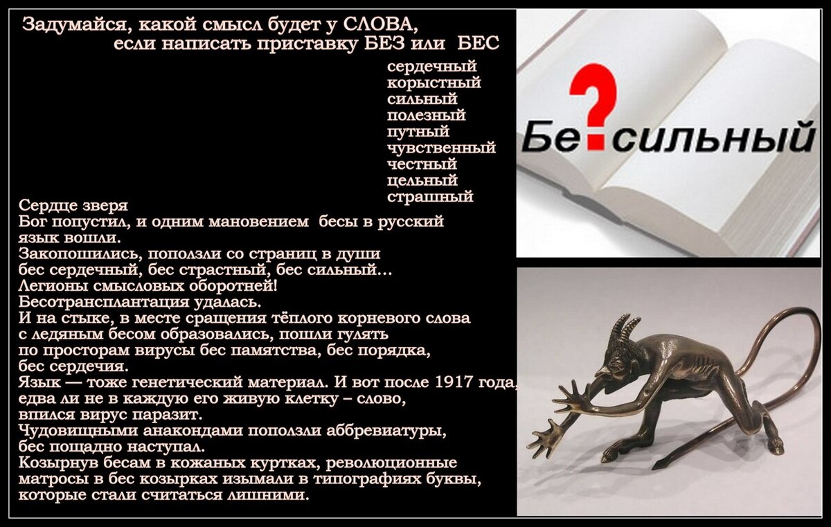 А вы знали, что существуют люди, которые намеренно не употребляют приставку "бес-"? Вместо неё всегда и везде они предпочитают использовать "без-". Так и пишут: БеЗссонница, беЗстрашие, беЗплодие, беЗплатно. Так и говорят, старательно выделяя звонкую "з" БеЗпорядок, беЗправие, беЗкорыстие. А причина проста. Приставка "бес", призывает бесов. Что, конечно, очень логично. От отрицателей этой приставки вы можете услышать замечательные прохладные истории о том, как раньше, до революции, всю историю Руси говорили и писали исключительно "без-" в начале слов. И лишь злобные иудеи-коммунисты-атеисты, пришедшие к власти и устроившие реформу русского языка, всё поменяли. А сделали это именно затем, чтобы простой православный русский мужик каждый день в своей речи "поминал беса". И чтобы было ему от этого НЕсчастье. И многое тут можно было бы сказать. Например о том, что разночтения ( то есть разнописание приставок "без-" и "бес-") встречаются в книгах и документах века с XIV, а то и раньше. Чт