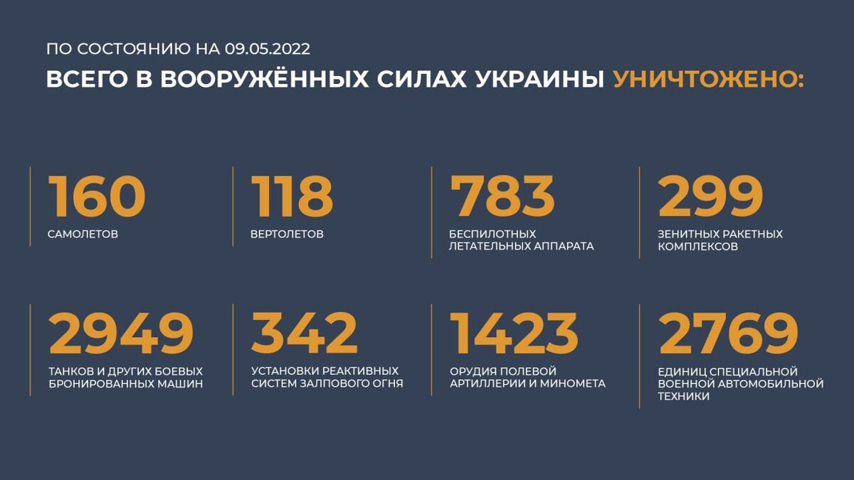 ◽️ Вооруженные Силы Российской Федерации продолжают специальную военную операцию на Украине. 💥 Высокоточными ракетами воздушного базирования ВКС России в течении ночи уничтожены в районе населенного пункта Попасная два пункта управления и украинская батарея реактивных систем залпового огня «Град», в районе Лисичанска 18 районов сосредоточения живой силы и военной техники, в районе Золотого радиолокационная станция контрбатарейной борьбы производства США. В районе населенного пункта Арциз Одесской области высокоточными ракетами «Оникс» берегового ракетного комплекса «Бастион» уничтожены на площадке подскока украинские вертолеты. 💥 Оперативно-тактической и армейской авиацией поражено 52 района сосредоточения личного состава и военной техники, а также склад боеприпасов в районе населенного пункта Глухов. 💥 Ракетными войсками и подразделениями артиллерии поражены восемь пунктов управления, 26 артиллерийских подразделений на огневых позициях, а также 211 районов сосредоточения ж