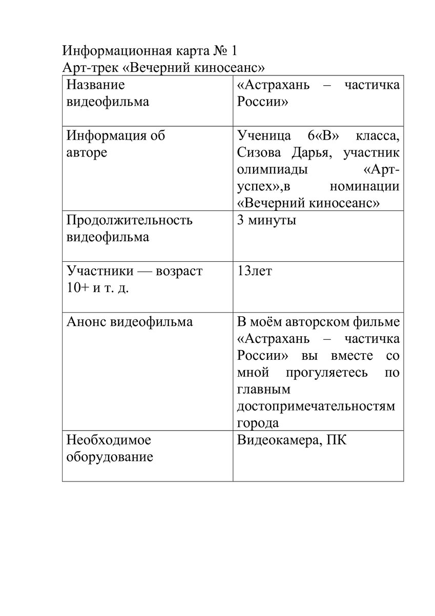 Информационная карта №1 Арт-трек "Вечерний киносеанс" Сизова Дарья 6В Информационная карта №2 Арт-трек "Мир глазами детей" Щелочкова Татьяна 6А Информационная карта №3 Арт-трек "Театральные подмостки" Ефимова Дарья 7Б Информационная карта №4 Арт-трек "Картинная галерея" Мусаева Эльнара 7А Информационная карта №5 Арт-трек "Арт-город" Обручева Полина 6Б Информационная карта №6 Арт-трек "Танцпол" Соколова Алина 6В Информационная карта №7 Арт-трек "Концертный зал" Клюкина Анна 8А Информационная карта №8 Арт-трек "Арт-директор" Кляшторная Ольга 8А Информационная карта №9 Арт-трек "Hand Made" Агаева Амелина 5В Информационная карта №10 Арт-трек "Книжная полка" Баксаисова Асель 9А Информационная карта №11 Арт-трек "Виртуальная реальность" Суханкина Елизавета 8А