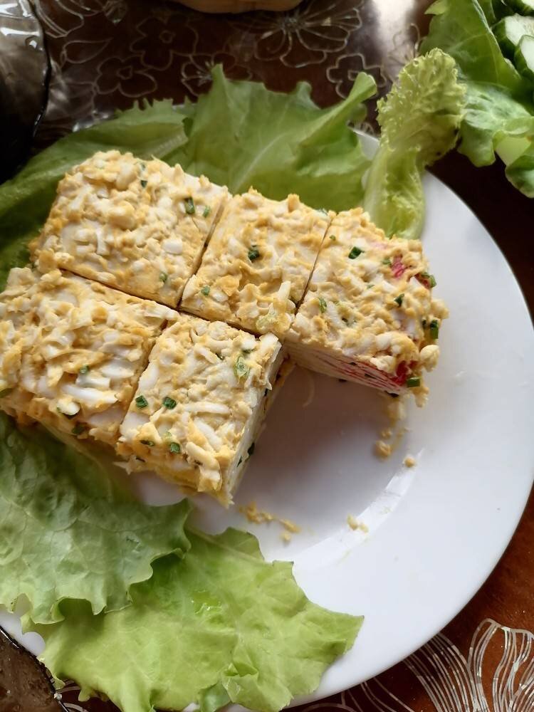 При выборе крабовых палочек для этого рецепта обратите внимание на то, чтобы они хорошо разворачивались. #пикник Ингредиенты: крабовых палочек, зелёный лук, вареных яиц, майонез для заправки, чеснока Способ приготовления: Первым делом нужно распаковать и развернуть крабовые палочки. Для того чтобы облегчить эту задачу опусти крабовые палочки на 1 мин в кипяток. Варёные яйца натираем на терке, добавляем измельчённый чеснок, соль по вкусу, нарезанный зелёный лук и заправляем это все майонезом. Хорошо перемешиваем. Теперь собираем наш торт: на тарелку укладываем крабовые палочки и намазываем каждую пластину начинкой. Сверху и по бокам также наносим тонким слоем начинку. Наш закусочный торт готов! Приятного аппетита!