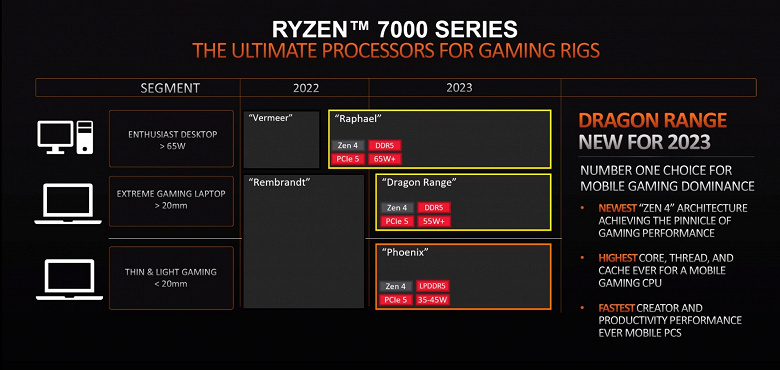 Процессоры Raphael (Ryzen 7000) в исполнении LGA1718 выйдут в этом году, мощные APU Dragon Range для ноутбуков — в следующем году AMD опубликовала дорожную карту выпуска CPU и APU Ryzen 7000 Компания AMD кое-что рассказала о процессорах Ryzen 7000, опубликовав дорожную карту. Это картинка подтверждает то, о чём говорилось ранее — компания полностью перейдёт на оперативную память DDR5 и шину PCIe 5.0 в сегментах настольных ПК и мобильных компьютеров. Это часть новшеств архитектуры Zen4, положенной в основу Ryzen 7000. Первыми Ryzen 7000 выйдут для настольных компьютеров — к концу текущего года. Они будут представлены исполнением LGA1718, TDP — от 65 Вт. Ryzen 7000 для ноутбуков выйдут в начале 2023 года в рамках двух семейств: Dragon Range и Phoenix. TDP Dragon Rage — от 55 Вт и выше, эти APU предназначены для использования в «экстремальных игровых ноутбуках», TDP Phoenix — 35–45 Вт, на их базе будут строиться тонкие и лёгкие ноутбуки нового поколения. Источник Ставьте лайки и подписыва