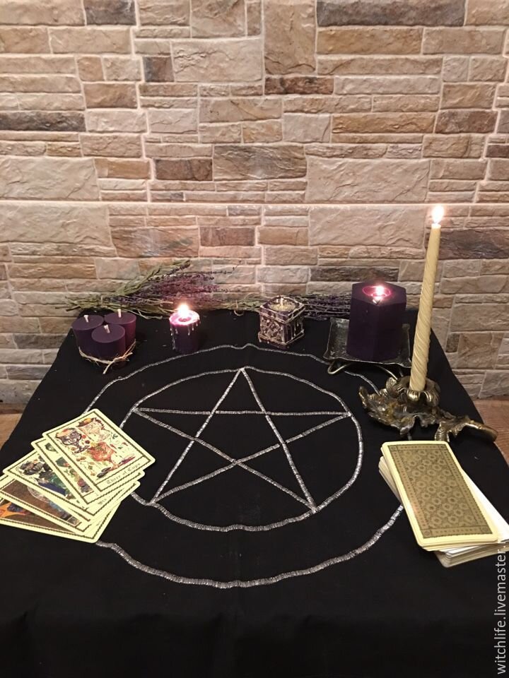 Алтарное покрывало. Начало в предыдущих постах. Для определенного ритуала нужна ткань-подстилка определенного цвета, на которую ставятся обрядовые вещи. Это помогает лучше сконцентрировать энергии нужного свойства. Например, для любовных обрядов хороша ткань красного и розового цветов. Для денежных – зеленого, золотого, коричневого цвета. Для обрядов исцеления – зеленого, белого, голубого и красного (красный цвет дает пациенту силы для выздоровления). Универсальной является черная ткань – она позволяет концентрировать любые виды энергий и содержать алтарь в чистоте. Белая ткань, наоборот, энергии рассеивает, но она хороша для чистящих ритуалов. Хотя она и чаще и быстрее загрязняется. У вас может быть постоянное алтарное покрывало с нанесенными символами, для усиления любых ваших ритуальных действий. Натуральной будет ткань алтарного покрывала или синтетической – это особого значения не имеет, если вы используете себе для помощи только ее цвет. Конечно, натуральная ткань несет дополнит