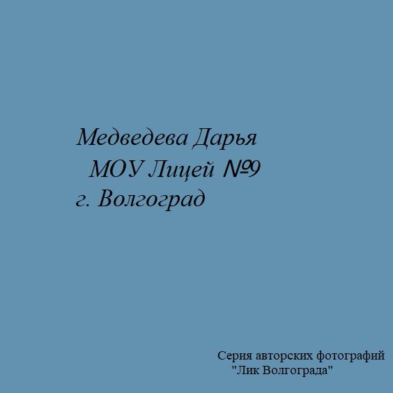 Лик Волгограда Медведева Дарья МОУ Лицей №9 Волгоград «Предметная или архитектурная съемка» номинация «Мир глазами детей» в тематике Года культурного наследия Креативная олимпиада "Арт-успех"