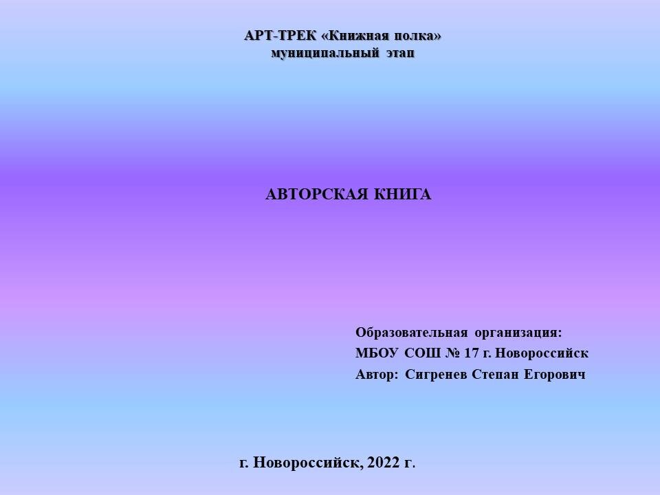 Автор - Сигренев Степан Егорович ОО - МБОУ СОШ № 17 г. Новороссийск Номинация - Авторская книга