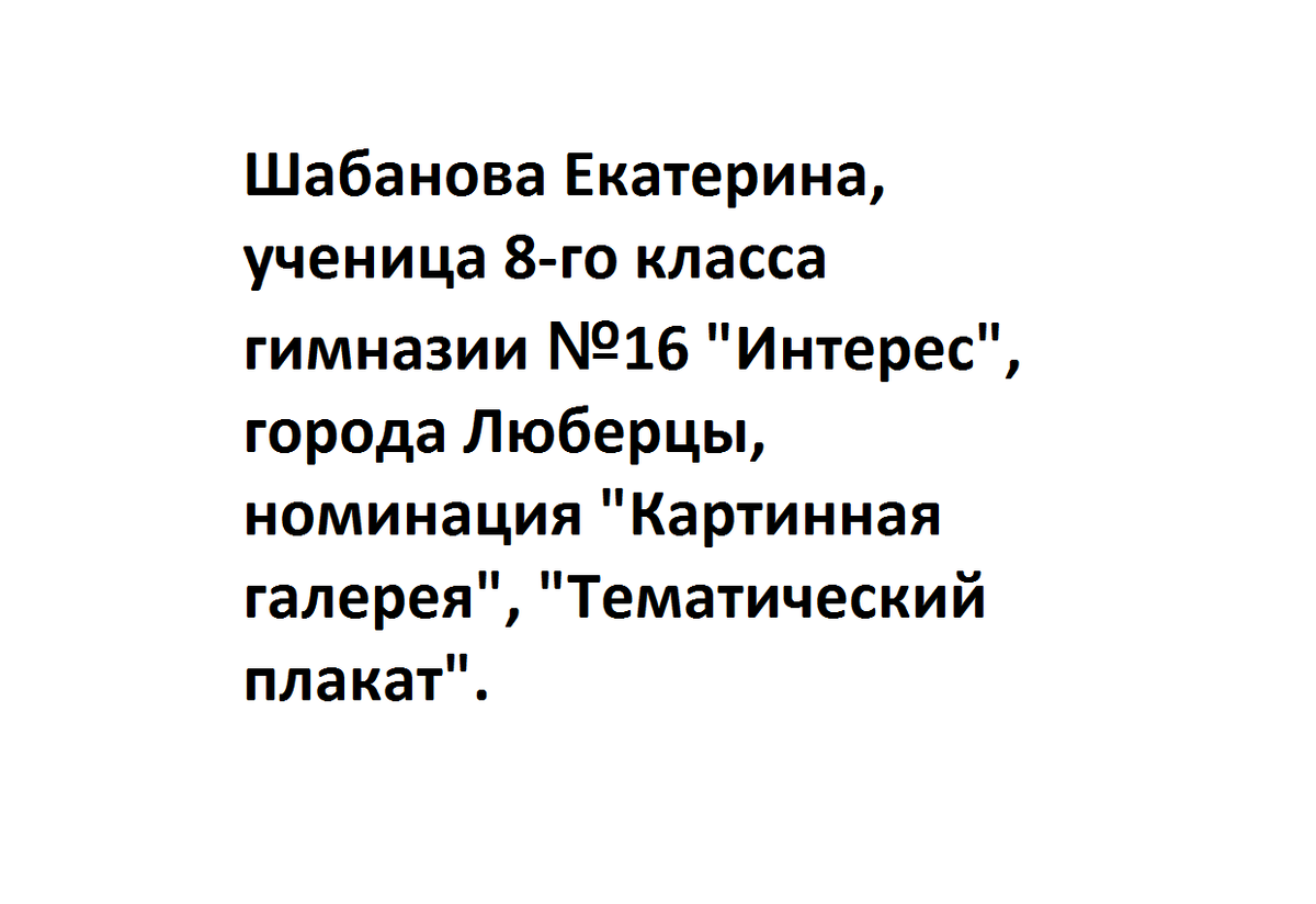 Шабанова Екатерина, 8 класс, МОУ гимназия № 16 "Интерес",г. Люберцы, номинация "Картинная галерея", тематический плакат.