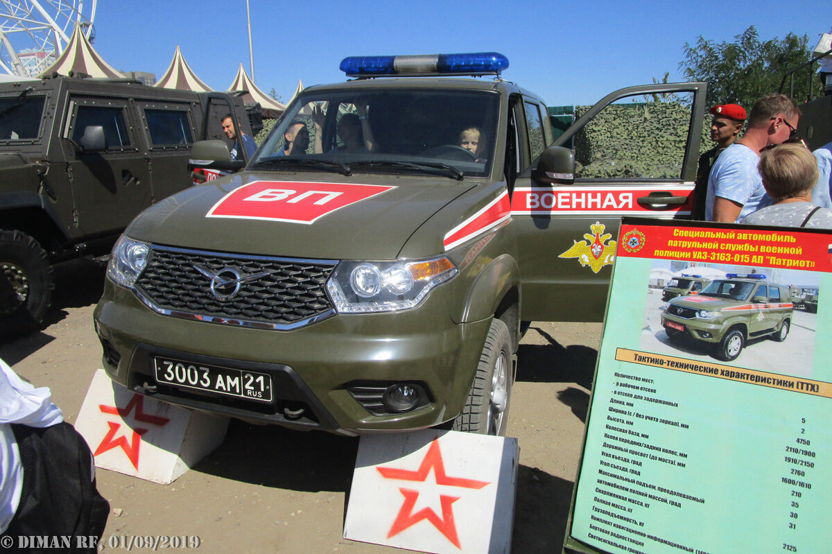 Сегодня фотографии с выставки военной техники на день города Волгограда 1 сентября 2019 года в центральном парке культуры и отдыха. Первая часть будет посвящена автомобильной технике, представленной на выставке либо окружавшей экспозицию. Начну с продукции Ульяновского автозавода. УАЗ-3163-015АП «Патриот» Специальный автомобиль военной полиции предназначен для обеспечения правопорядка и воинской дисциплины на территории гарнизонов. Отличительной особенностью спецавтомобиля является наличие отсека для двух задержанных. УАЗ-3163-015АП «Патриот» Следующий автомобиль предназначен для обеспечения деятельности военной автоинспекции. Внешних отличий от стандартного УАЗа у этого автомобиля нет. УАЗ-396219 Появление следующего автомобиля на выставке можно считать курьёзом. Нет, сам по себе санитарный УАЗ «Таблетка» интересен как экспонат выставки. Но выставлять тринадцатилетний автомобиль вряд ли допустимо. Надеюсь, что этот автомобиль демонстрирует не реальное положение дел в отечественной