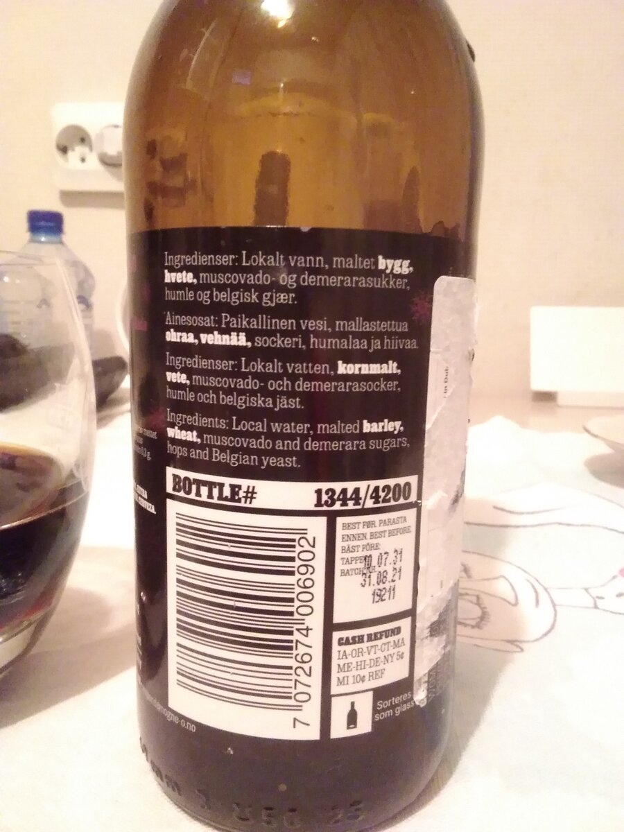 На это полукруглое число выпал любимый стиль от любимой пивоварни. Это barrel aged квадрупель In Dulce Jubilo, который был сварен норвежцами из Nogne O ограниченным тиражом в 4200 бутылок, и перед розливом в тару выдерживался год в бочках из-под хереса Олоросо. На первом фото мы видим типовое описание ингредиентов, использованных при варке, где кроме привычных составляющих вновь упомянуты редкие сорта сахаров, которые я уже встречал на предыдущих норвежских пивасах. Сахар демерара и сахар мусковадо опять обещают нам что-то липкое и сладкое, налитое в бутылку номер 1344. И срок годности вновь 10 лет. Другая часть этикетки описывает типовые ТТХ : Цена около 1000 р в баре TBP А что же в бокале? Матово-непрозрачный, красно-коричневый напиток слабой газации. Аромат смеси портвейна и красного сухого вина, кожи и ежва дымности. Во вкусе сладкие ноты фиников, чернослива, шоколадной горечи балансируются бочковой деревяшечной кислинкой, текстура пива текучая, тонкая и чуть маслянисто-сливочна