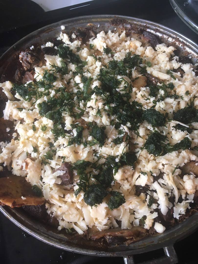 Этот рецепт я сама в голове построила )) получилось очень вкусно, вся семья довольна Ингредиенты: картофелей, гр говядины, гр грибов, луковица, морковки, Соль, Перец, Майонез, гр Томатная паста, Чеснок, муки, ст воды Способ приготовления: Режем картофель и выкладываем на противень. Солим и перчим, смажем майонезом. Грибы режем, с луком, чесноком и Морковкой обжариваем Солим и перчим, добавляем приправы по вкусу. У меня была (аджика, укроп, перец, соль). Мясо обжариваем до румянца, добавляем томатную пасту. Солим, перчим. Добавим 3 стакана воды. Муку немного обжарим и чеснок, добавим бульона с мяса. Все соединяем и тушим 40 мин. Делаем слои в нашей запеканке, слой картошки, следом поджарка из грибов, следом мясо в соусе. И так пошагово. На конец можно посыпать сыром)) украсить помидоркой, зеленью Приятного аппетита ☺️☺️☺️