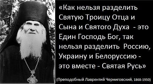 «Как нельзя разделить Святую Троицу, Отца и Сына и Святого Духа — это Един Господь Бог, так нельзя разделить Россию, Украину и Белоруссию, это вместе — Святая Русь».