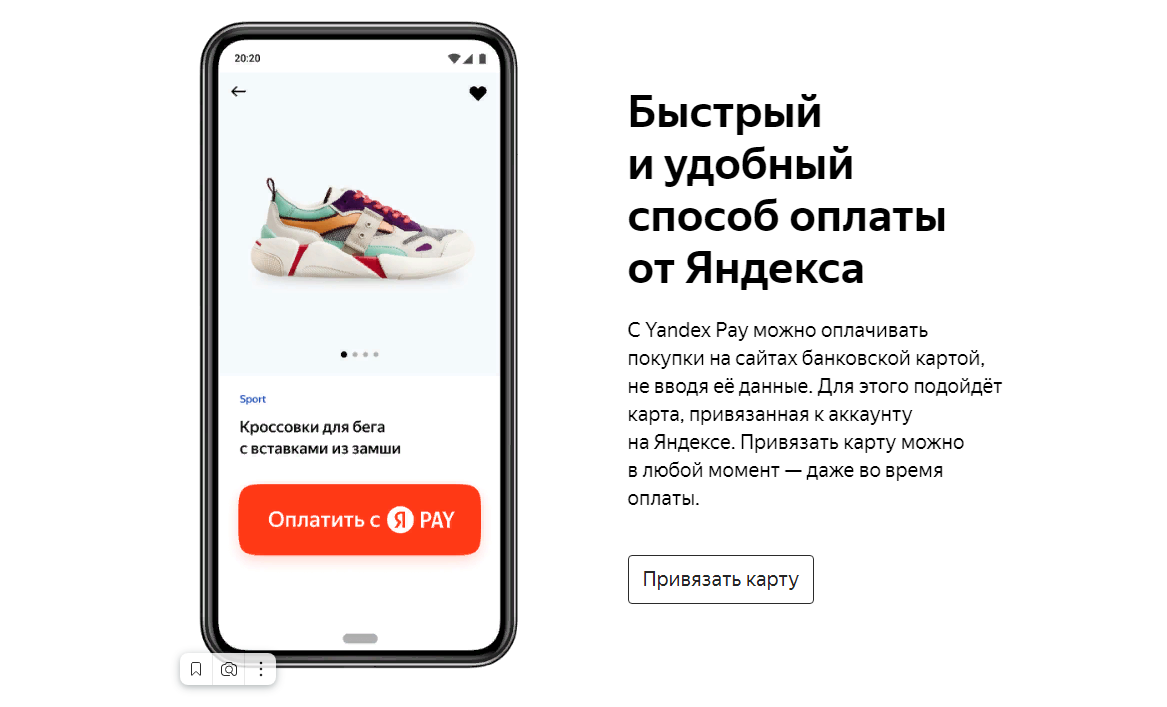 Yandex Pay — платёжный сервис компании «Яндекс». Запущен 10 марта 2021 года Позволяет оплачивать покупки банковской картой без ввода данных.[2] В целях безопасности они хранятся в зашифрованном виде в аккаунте «Яндекса». Для безналичной оплаты нужно выбрать ранее сохранённую в личном кабинете карту. Пользователям необходимo привязать карту к аккаунту на «Яндексе». Есть возможность использования сразу нескольких карт. Сервис работает только на сайтах в большинстве популярных браузеров.[5] Полный набор функций доступен для совершеннолетних пользователей. Система работает с картами Mastercard, Visa и «Мир» любых банков. В прошлом году «Яндекс» разделила свои активы со Сбербанком. К банку полностью отошел финансовый сервис «Яндекс.Деньги», который после получил ребрендинг. А сама «Яндекс» стала единственным владельцем торговой площадки «Яндекс.Маркет». После этого оставшаяся без финансового сервиса компания «Яндекс» решила не мелочиться и запустила сразу платежную систему Yandex Pay. Судя