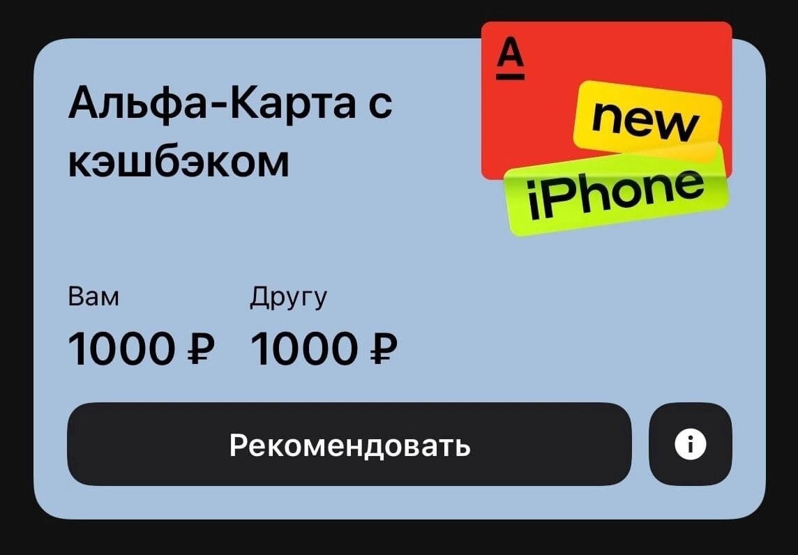Новая акция от Альфа-Банка! Можно получить 1000р за заказ дебетовой карты для новых клиентов. 1) Нужно перейти по ссылке - https://alfa.me/yJweew (только по ней, иначе бонус может быть не засчитан) 2) Заказать бесплатную дебетовую карту (с 18 лет) 3) Забрать карту, и сделать одну любую покупку, хоть даже за 1 рубль по этой карте. (обязательно для получения 1000р) 4) И вам придёт на эту же карту бонус в размере 1000 рублей. (обычно приходит в раздел "кэшбэк") Условия очень лёгкие, всем удачи! (карта полностью бесплатная, банк есть во многих городах России)