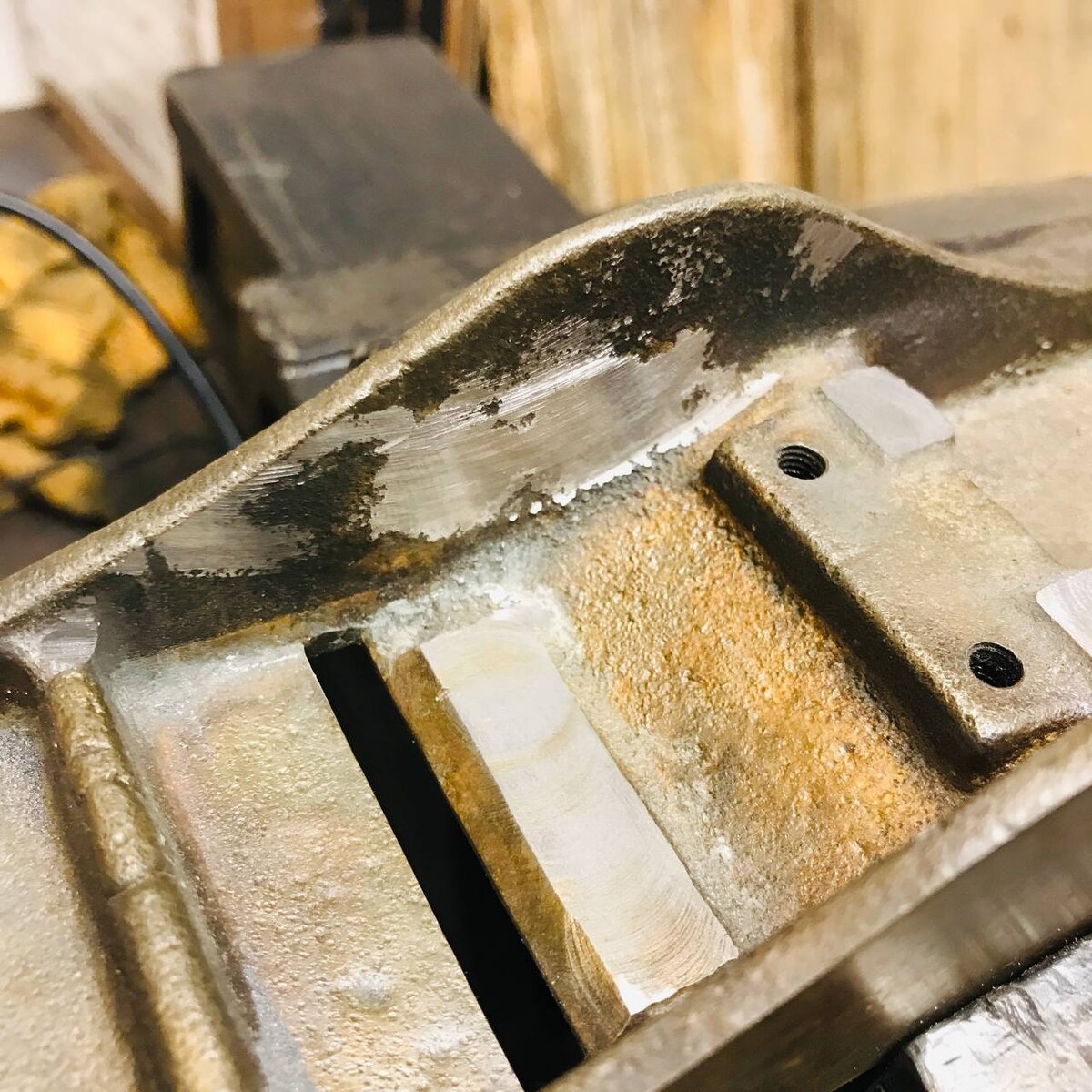 Добрый день. Этот пост третий из нескольких, где я довожу до рабочего состояния рубанок Сестрорецкого завода им. Воскова. Покраска колодки. Перед покраской колодки я решил убрать дефекты литья. Наплыв на щеке с внутренней стороны снял болгаркой. На фотографии видны рыжие пятна на колодке. Это ржавчина, которая образовалась после извлечения колодки из спецраствора на воздух. Видимо остатки кислоты на воздухе из преобразующего средства превращаются в окисляющее. Страшного в этом ничего нет, эти рыжие пятна я легко удалю металлической щёткой перед оклеиванием в покраску. Один маленький наплыв мешал ровно установить лягушку, его я подчистил бормашинкой. Поверхности приливов, куда упирается лягушка на заводе обрабатывались грубой фрезой, и на данной колодке никогда более их не касалась рука человека. Сильно зашлифовывать их не стал, немного прошёл маленьким абразивным камнем вручную, чтобы посбивать вершины после фрезеровки. Сама лягушка вставала с небольшим люфтом. На её привалочных плос