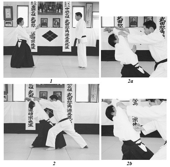 1. Лицом к лицу с противником 2, 2a, 2b. В тот момент, когда противник поднимает руки для удара сверху — другими словами, когда его атака находится в «состоянии Инь», — примените Айки, немедленно сделайте шаг вперёд левой ногой, используя левую руку, чтобы толкнуть его правый локоть вверх к его лицу, чтобы вывести его из равновесия. Крепко возьмите его за локоть левой рукой, используя большой палец левой руки, чтобы контролировать жизненно важную точку на внутренней стороне его руки чуть выше локтя (захват предплечья возле локтя является ошибкой, так как это дает противнику достаточную свободу движений, чтобы ударить вас локтем). Контролируя таким образом противника, ударьте его в бок чуть ниже подмышки выдвинутым суставом среднего пальца так, как если бы вы кололи кинжалом. 3, 3a.Продолжайте контролировать локоть противника и используйте ребро ладони своей правой руки, чтобы обхватить правое запястье противника режущим движением вниз, одновременно делая шаг вправо примерно под углом 4