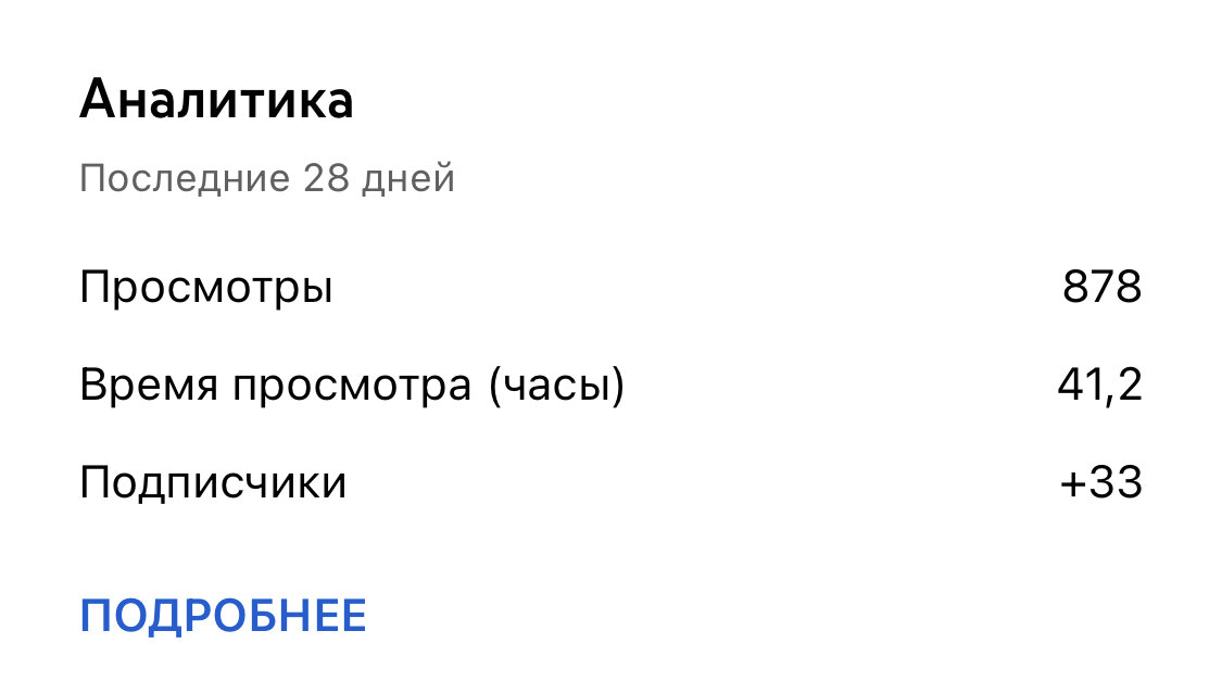 Создала и веду два канала: блог о жизни в России, и мобильные игры. Блог о жизни в России, общее число просмотров 878, подписчиков 33. Мобильные игры, общее число просмотров 157, подписчиков 2. Обоим каналам месяц. Хочу поднажать, за следующий месяц выйти на монетизацию. Чтобы в моих видео начали показывать рекламу, необходимо набрать 4000 просмотров и 1000 подписчиков. Канал «блог о жизни в России» заходит лучше, т.к. затрагиваю темы про санкции, продукты, празднование дня Победы. Но стараюсь вести блог вдалеке от политики. Аудитория живая, пишут комментарии. Свободно ещё не могу говорить, общаться из-за этого записывать не совсем полноценные видео. Изучаю английский, мой уровень ноль, прям совсем базовый. Не сдаюсь, каждый день смотрю по 15-20 минут сериал на английском, занимаюсь в приложении. Появляется больше понимания, о чем идет речь, могу читать более-менее, но говорить 🗣 строить предложения ещё затруднительно. Игровой канал, по рекомендациям опытных ребят нужно выкладывать по