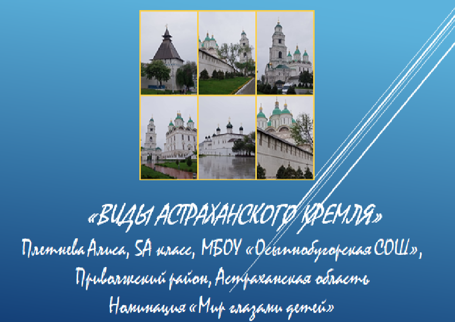 «Виды Астраханского кремля», Плетнева Алиса, 5А класс, МБОУ «ОсыпнобугорскаяСОШ», Приволжский район, Астраханская область Номинация «Мир глазами детей» Астраханский кремль-памятник федерального значения, средоточие и венец красоты города Астрахани, его главная достопримечательность. Архитектурный ансамбль кремля включает в себя 7 башен, соединённых кирпичными зубчатыми стенами. Астраханский кремль-комплекс оборонных сооружений первоначально возведенных в конце 16-го-начале 17-го века в дельте Волги, в историческом центре современной Астрахани. Укрепления были построены русскими зодчими как главная опора южных рубежей Русского царства. С течением веков башни разбирали и заменяли более прочными, ансамбль дополняли новыми зданиями. Астраханский кремль- ключевой объект, которые посещают туристы во время знакомства с городом. Это не только памятник архитектуры 16-20 века, но и этнографический и исторический музей, рассказывающий об Астрахани и обо всём российском государстве. Астраханский к