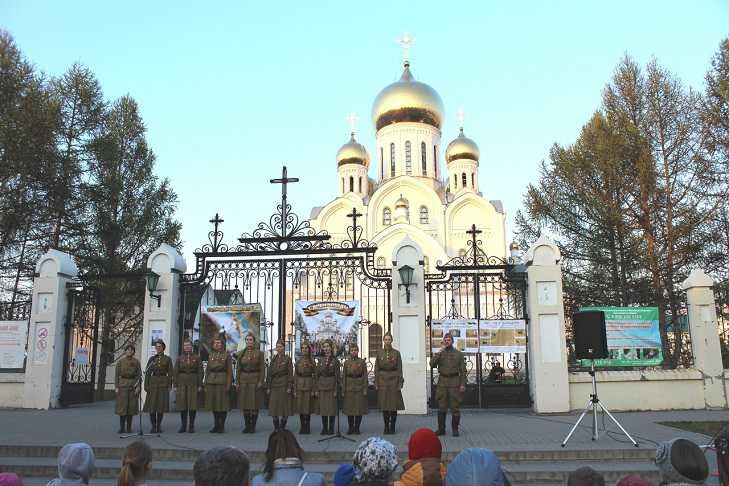 В понедельник вечером, 9 мая, молодые люди в военной форме времен Великой Отечественной войны выстроились на ступенях центрального входа Троице-Владимирского храма. Молодежный хор собора исполнил известные песни военных лет: «Хотят ли русские войны?», «Поклонимся великим тем годам», «Алексей, Алешенька, сынок» и другие. Песня «На Безымянной высоте» была посвящена подвигу новосибирцев. Шестнадцать наших земляков погибли, защищая эту высоту в сентябре 1943 года. Десять из них ушли на войну из Кировского района. О подвиге фронтовиков, выбравших после войны путь монашества, рассказали учащиеся Свято-Владимирской гимназии. Ребята держали в руках штендеры с фотографиями архимандрита Алипия (Ивана Воронова), архимандрита Наума (Байбородина), архимандрита Кирилла (Павлова), иеромонаха Иосифа (Бирюкова), архимандрита Нифонта (Глазова), монахини Адрианы (Натальи Малышевой) и других, пополняя Бессмертный полк. Зрителей разного возраста - семьи с детьми, подростков, пожилых людей - объединили восп