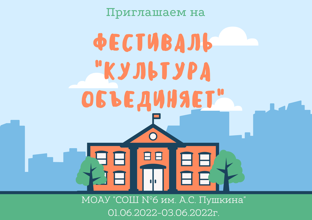 «Культура объединяет» Команда организаторов– школьное волонтерское движение «Неравнодушные сердца» МОАУ «СОШ №6 им. А.С. Пушкина» города Бузулука Оренбургской области и команда олимпиады «Арт-Успех» МОАУ «СОШ №6 им. А.С. Пушкина» города Бузулука. Место проведения– база проведения - МОАУ «СОШ №6 им. А.С. Пушкина» города Бузулука Оренбургской области. Продолжительность фестиваля– 01.06.2022 – 03.6.2022гг. Приглашаемые участники– обучающиеся МОАУ «СОШ №6 им. А.С. Пушкина» в возрасте от 7 до 17 лет. Анонс фестиваля Большинство людей, которые приходят на фестивали по мастер-классам, хотят почувствовать себя в какой-то новой роли, отличающейся от их обычных жизни, преобразиться в художника, танцора, писателя и даже арт-директора. Это важный момент, ведь жизнь одна, и мы не должны упускать возможность научиться чему-то новому. Наша замечательная команда поможет вам испытать положительные эмоции, получить новые знания, умения и навыки, продемонстрировать все свои лучшие качества. Именно с 1 по