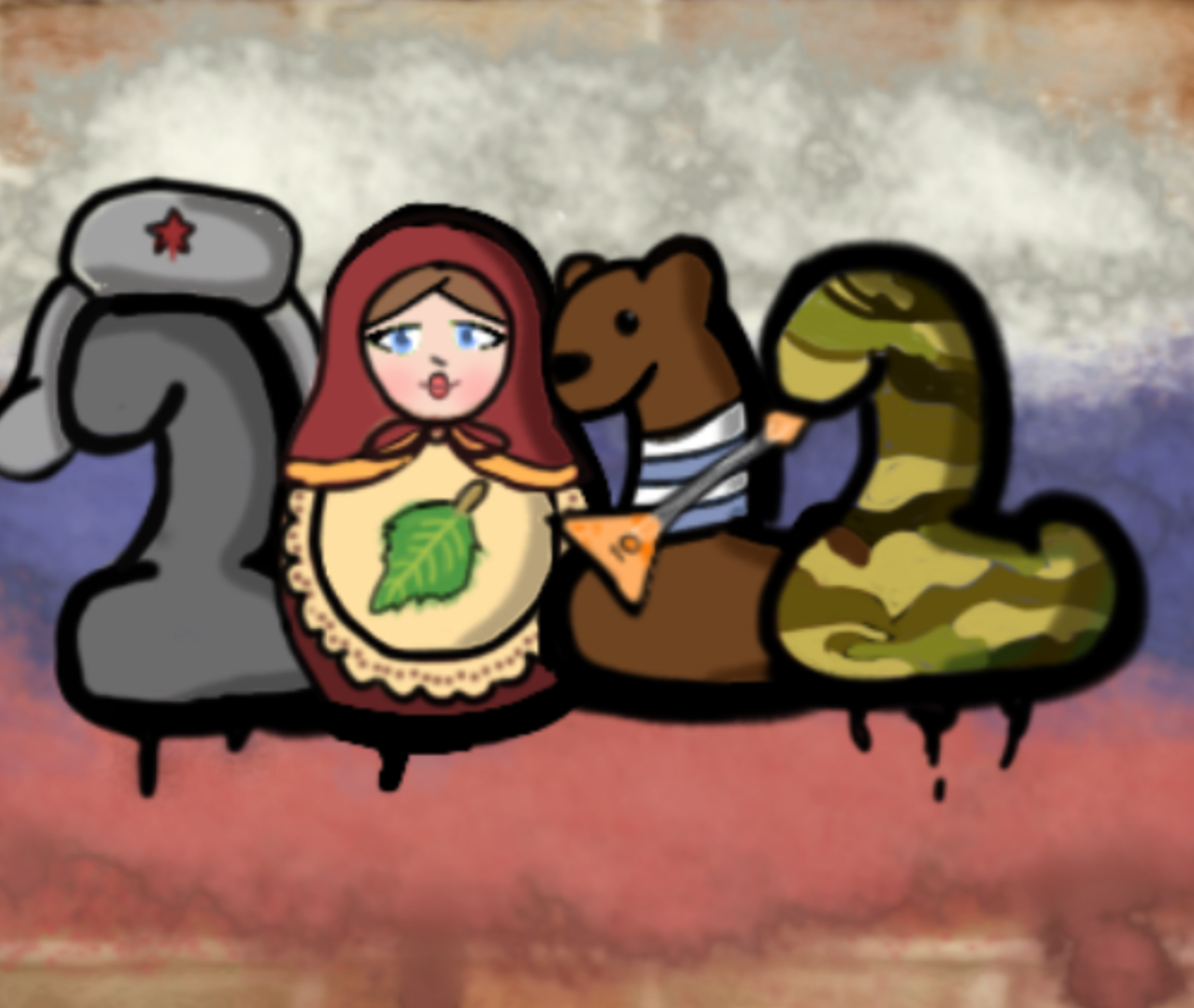 Разработано в приложении "ibisPaint x" Отражает символы 2022 года. «Ноль» в виде матрешки , цифра «2» в виде медведя с балалайкой, солдата в камуфляжной летней форме и зимней форме с шапкой – ушанкой с красной звездой.