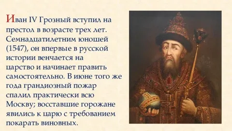 Получив власть, без регентского совета, Иван 4 решил, что на этом его мучения закончились, и теперь он действительно главный человек в стране с абсолютной властью над другими. Реальность же была другой, и в скором времени юноша это понял. Лето 1547 года оказалось засушливым, а 21 июня разыгралась сильная буря. Загорелась одна из церквей и из-за сильного ветра огонь ста быстро распространяться по всей деревянной Москве. Пожары продолжались 21-29 июня.