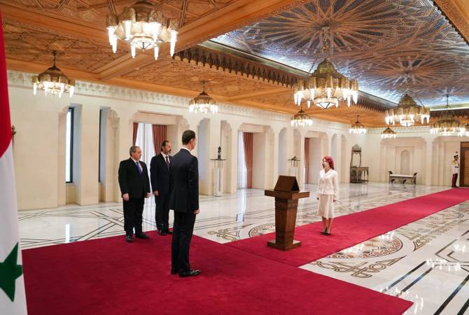 В президентском дворце Сирии состоялась церемония приведения к присяге новоназначенного Чрезвычайного и Полномочного посла Сирийской Арабской Республики в Республике Армения Норы Арисян. Как сообщает Арменпресс со ссылкой на Perio News, после церемонии новоназначенного посла приветствовал президент Сирии Башар Асад и пожелал ей успехов. Президент передал послу Арисян свое видение отношений между двумя странами . На церемонии присутствовали министр иностранных дел Сирии Фейсал Микдад и министр сирийского президентского дворца Мансур Аззам.