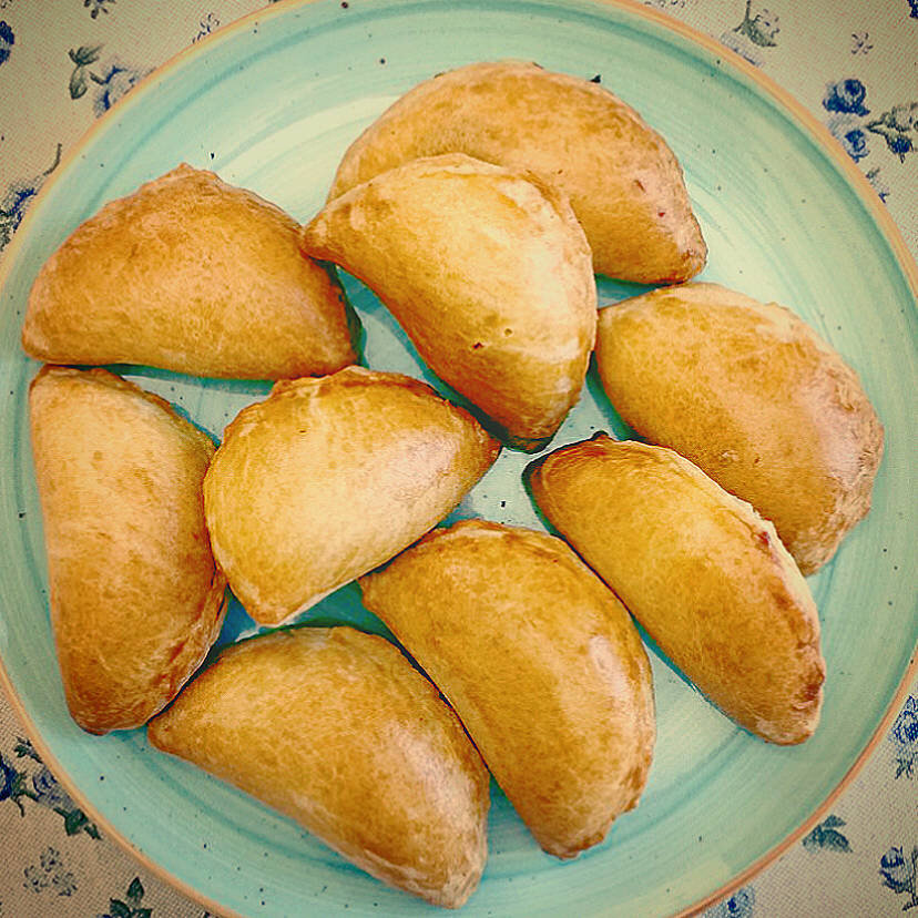 Ингредиенты: борошна, вершкового масла, солі, яйце, оцту, холодної води, куряче філе, печериць, цибуля, Сіль, спеції Способ приготовления: Розтираємо борошно з холодним вершковим маслом Змішуємо в окремому посуді яйце, воду, сіль, оцет. Додаєм до борошна Замішуємо тісто, залишаєм в холодильнику на 1 годину. Для начинки : запекти в фользі зі спеціями куряче філе, посмажити гриби з цибулею та прянощами до готовності, порізати, змішати Розкочуєм на присипаній борошном поверхні, вирізаємо кружечки, один край змочуєм яйцем, викладаєм начинку, формуємо вироби, змащуєм яйцем з молоком. В розігріту духовку до 180 ° ставимо на 15-20хв.