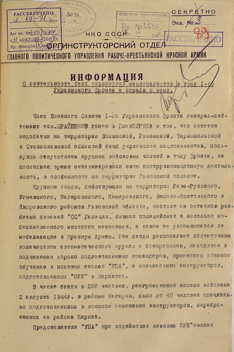 Из информации Главного политического управления Красной Армии «О деятельности банд украинских националистов в тылу 1-го Украинского фронта и борьбе с ними» от 23 сентября 1944 года Крупные банды, действующие на территории Рава-Русского, Угневского, Магеровского, Немировского, Велико-Мостовского и Яворовского районов Львовской области, состоят из из остатков разбитых дивизий «СС» Галиция, бывших полицейских и насильно мобилизованного местного населения, а также из уклоняющихся от мобилизации в Красную Армию. Приводятся случаи бандитских нападений на железнодорожные эшелоны, убийство мирных украинцев за отказ вступать в «УПА», убийство советских пограничников и польских семей. Источник: silavpravde.mil.ru #СледственныйКомитет #СКРоссии #СКР #ИЦСКРФ #ИЦСКР #Информационныйцентр #СКРФ #АрхивыПомнятВсё