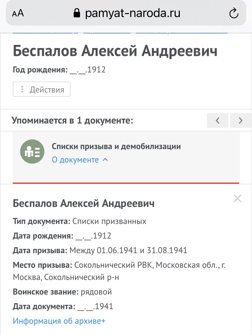 Тридцатилетние мужчины ушли на фронт добровольцами, оставив жён и детей. Ситуация была сложная, враг мощный, прущий к Москве беспрепятственно. Мало кто верил, что вернётся, лишь надеялись… Женщины, старики и дети уезжали в эвакуацию на восток, оставляя дома, куда и вернуться-то потом было невозможно. Некуда. В квартирах поселялись другие люди. Очень мало еды, вещей. Игрушек вовсе не было. Постоянный голод. Дети войны. Женщины, взвалившие на свои плечи тыл, а после новую жизнь, где ты не вдова, а жена пропавшего без вести. Родители долгое время ждали отцов. Ведь так не может быть, чтоб пропал… вдруг в плену или калека и не может вернуться Неужели какие-то безумные головы полагают, что это можно забыть, предать, переиначить?! Флоридов Геннадий Вениаминович Беспалов Алексей Андреевич. Мои деды, в два раза младше меня сегодняшней… Пропали без вести в том далеком 41-м . Вечная память и благодарность тому поколению, отстоявшим страну.