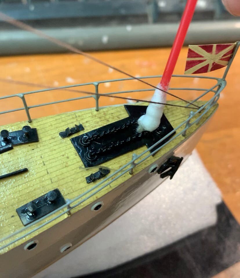 В этой статье расскажу вам поэтапно, как реставрировать корабль, а именно Канонерскую лодку «Карс». Модель довольно старая, сделана около 30 лет, поэтому мелкие детали сломаны и нуждаются в замене, а сама краска уже требует обновления. Но для начала немного истории о Канонерской лодке. Канонерская лодка "Карс" и однотипная с ней "Ардаган" - первые морские корабли с дизельным двигателем. Проектом предусматривалось следующее артиллерийское вооружение: два 120-мм орудия длиной 50 калибров, с углом обстрела 270°, четыре 75-мм пушки длиной 50 калибров (носовые — под полубаком, кормовые — на верхней палубе), угол обстрела каждой 120...130°, и четыре 7,62-мм пулемета, Два главных четырехтактных шестицилиндровых дизеля фирмы "Людвиг Нобель" проектной мощностью по 500 л. с. размещались в кормовом машинном отделении. Два вспомогательных дизеля мощностью по 65 л. с. размещались в носовом машинном отделении и приводили в действие генераторы постоянного тока. На полном ходу "Карс" развивал 15 узлов