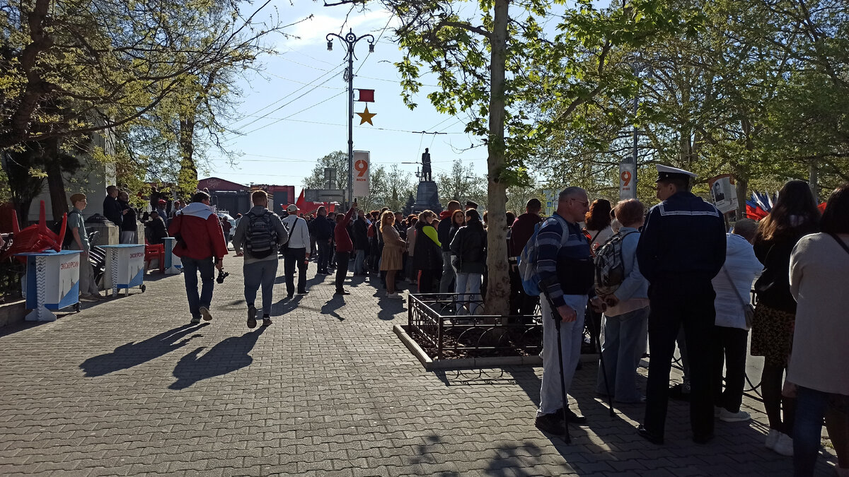 Итак, продолжу) Заняли мы с сыном места в первом ряду. Ну и, как всегда, классика жанра - воду заранее не купили. А тут начало припекать солнышко, сильно так... Людей всё прибавлялось. Рядом с нами встала группа женщин из города Кропоткина Краснодарского края. Познакомились, пообщались с ними. За полчаса до парада стало невыносимо припекать, я оставила сына постоять, а сама пошла покупать воду втридорога на площади, ну и по вкусной мороженке заодно) Еле отыскала потом место, где стояла и ребенка своего... Люди всё прибавлялись и прибавлялись. Но, говорят, что в этом году гораздо меньше народа было на мероприятии. Всё-таки, небо-то закрыто... И вот, 10-00 утра. Ровно минута в минуту начался парад. Конечно, всё действие было рассчитано больше на трибуны. Там и строились войска, там говорили речи командиры и губернатор. Там ездили на машине без верха военноначальники. А мы стояли и ждали - когда же пойдут войска и по нашей улице) Изначально, стоявший на посту рядом с нами матрос, на