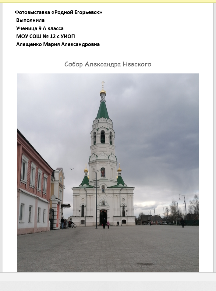 Алещенко Мария 9"А" и её Предметная и архитектурная фотовыставка, посвященная собору Александра Невского, дому Н.М. Бардыгина, зданию бывшей фабрики Хлудовых и памятнику покорителей космоса. На фото представлен результат работы участницы