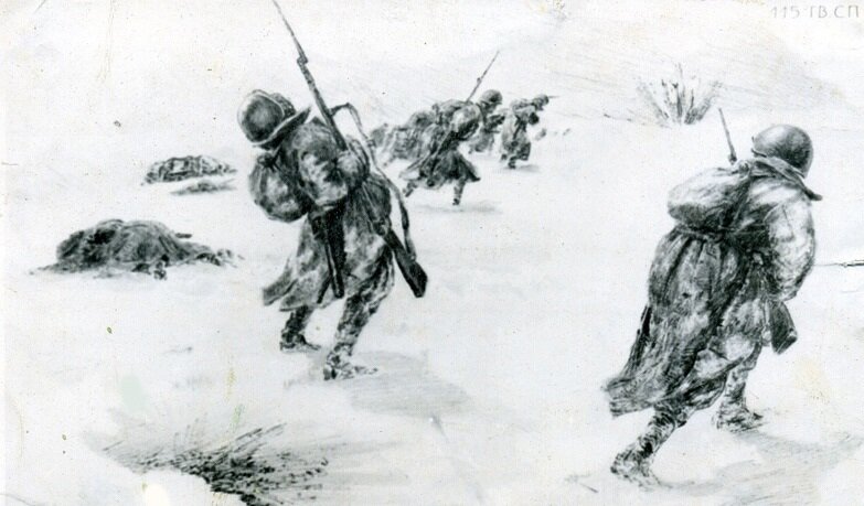"Наступило 16 декабря. Потеплело. Утро было туманное. Когда после артподготовки мы двинулись вперед, произошло то, что совсем не предусмотрели - при подъеме на кручу роты перепутались и командиры потеряли своих бойцов. Когда я выскочил на край, на открытом поле нас встретили ожившие огневые точки. То там, то здесь взвизгивали в воздухе, падали и скатывались вниз те, в кого попадало. Вдруг, я увидел пулеметчиков - они за скобу станины тянут свой пулемет. Колеса не крутятся, скользят. Вижу с какой злостью, бормоча ругательства, бойцы тащат его. Сзади поднимается "У-р-р-а-а-а-а-а". Бросок на траншеи. У окопов все завертелось. Из земли вырастали какие-то темные фигуры с поднятыми руками и широко открытыми ртами. Что-то ударило меня по каске и я упал".