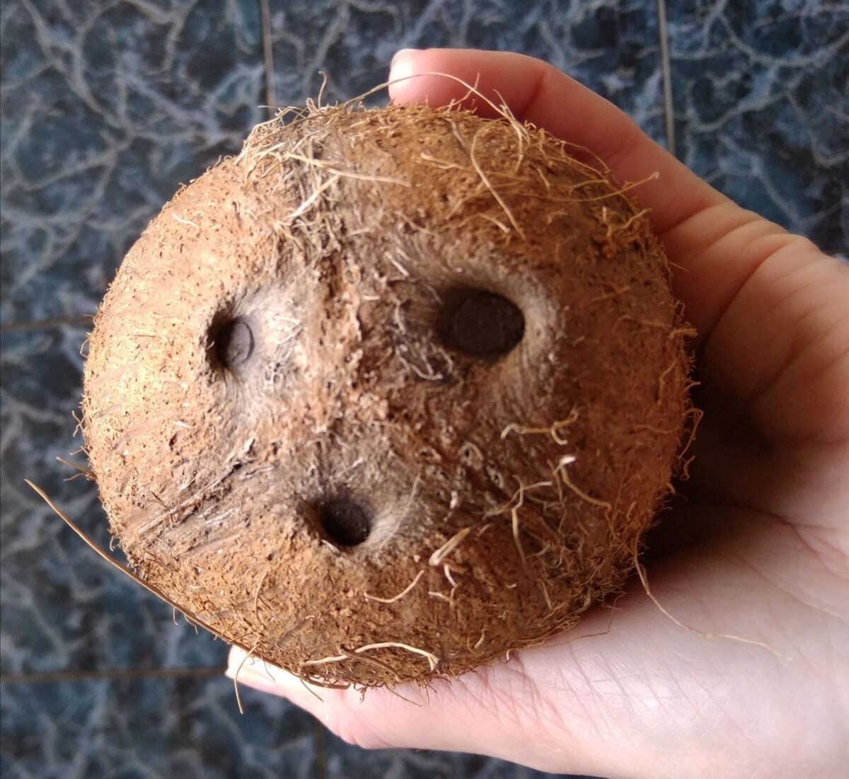На прилавках магазинов многих покупателей привлекает большой экзотический орех – кокос. Однако далеко не все решаются попробовать дивный плод: попробуй его ещё расколоть этот каменный «панцирь»! И даже насмелившись купить кокосовый орех, мы часто мучаемся, пытаясь извлечь из него вкусную начинку – ковыряем кожуру ореха ножом, бьем молотком, где ни попадя, пытаемся просверлить кокос и даже в сердцах кидаем его на пол! Если вы испробовали все эти методы «борьбы» с кокосом, а он все же остался целым и невредимым, пора переходить к плану Б – расколоть кокос по правилам! Для того, чтобы кокосовый орех покорился новому владельцу, нам нужно всего лишь два инструмента. Первый – тот, которым можно будет проковырять дырочки вверху плода (чистый толстый гвоздь или сверло диаметром чуть меньше диаметра темных пятен на кокосе), а второй – для непосредственного разбивания кокоса (кухонный или рабочий молоток). 1. Кладем кокос на твердую поверхность и поворачиваем к себе тремя темными кружками, кото