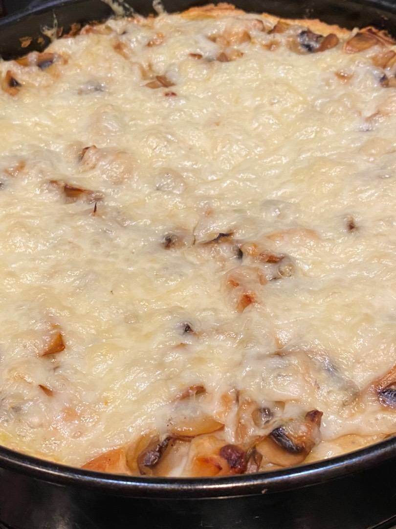 КБЖУ НА 100 гр: 132/10/4/14 Ингредиенты: гр Очищенного картофеля, Яйцо, гр Рисовой муки, по вкусу Соль, Начинка, Куриного филе, гр Шампиньонов, Репчатого лука, гр Греческого йогурта, Яйцо, чеснока, по вкусу Соль, перец, гр любого сыра 35% жирности Способ приготовления: Картофель и лук чистим. Нарезаем картофель кружочками и ставим вариться. Лук нарезаем кубиком. Куриное филе и грибы нарезаем на небольшие кусочки. Хорошо разогреваем антипригарную сковороду и выкладываем куриное филе. Обжариваем 2 минуты. К филе добавляем лук,грибы,чеснок и обжариваем 5 минут. Соль,перец по вкусу. С картофеля сливаем воду и толчем. Солим по вкусу и все хорошо перемешиваем. К картофелю добавляем яйца и муку. Все хорошо перемешиваем. В форму выкладываем картофельную основу и формируем бортики. В начинку добавляем яйца и йогурт, и перемешиваем. Начинку перекладываем в форму. Выпекаем в разогретой духовке при температуре 200 градусов 20 минут. После посыпаем сыром и отправляем в духовку на 5 минут. Пирог гот