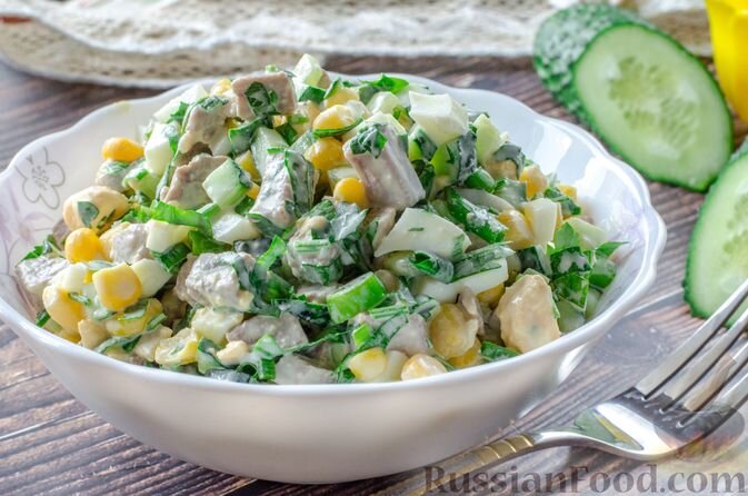 Салат с говядиной, кукурузой и огурцом. Греческий салат. Салат с курицей, грибами и черносливом. Салат из свёклы с киви и орехами. Салат с фасолью, сельдереем и оливками. Греческий салат – по-праздничному яркий и сочный. Свежие помидоры, огурцы, сладкий перец, лук, маслины и нежная фета выкладываются на салатные листья и поливаются лёгкой заправкой из оливкового масла с лимонным соком и базиликом. Сытный салат с курицей, грибами и черносливом удачно впишется в любое меню. Отварное куриное филе прекрасно сочетается с обжаренными грибами, сыром и яйцами. Чернослив делает салат оригинальнее. Интересный салат из свёклы с киви, орехами и красным луком удивляет нетривиальным сочетанием ингредиентов: вареную свёклу дополняют киви, маринованный красный лук, грецкие орехи и зелень. Вкус салата получается настолько любопытным, что салат хочется пробовать и пробовать, разгадывая его компоненты. Салат с консервированной фасолью, сельдереем, оливками и луком понравится приверженцам правильного пит
