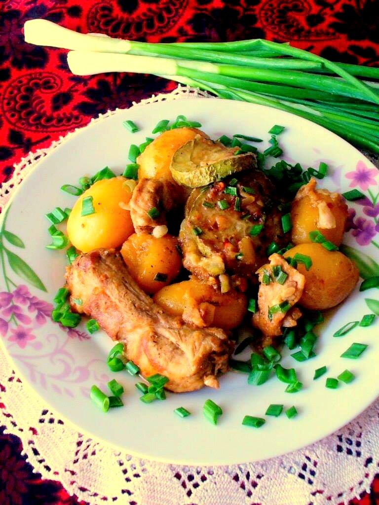 Типичное для Крыма блюдо. Практически - на каждом столе. Мясо может быть любым, и курица и говядина и свинина, подойдет любой вариант. В Крыму это блюдо традиционно называют " соус". Свиные ребрышки - 0.7 гр, Картофель молодой - 0.7 гр, Кабачок - 1 крупный, около 0.4 гр, Растительное масло для жарки, Мука для панировки, Соль, черный перец, Лавровый лист, Паприка хлопья - 1 ч л, Приправа из сушеных овощей - 1 ч л, Кориандр - две щепотки, Зеленый лук - опционально. Ребрышки нарезать. Картофель очистить, вымыть. В сотейнике разогреть растительное масло. Обжарить ребрышки до зарумянивания. Добавить картофель и продолжать обжаривать. Посолить и поперчить. Затем добавить специи, очищенную воду. Как только вода закипит, убавить нагрев, закрыть крышку и тушить, практически до готовности картофеля. Кол - во воды - по вкусу. Я добавляю до половины объема продуктов в сотейнике. Кабачок нарезать кружочками. Посолить и поперчить. Панировать в муке и обжаривать до зарумянивания, с двух сторон