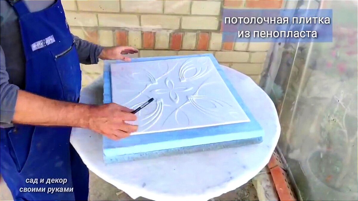Утеплить фундамент, отдекорировать тёплой плиткой углы, или сделать обрамление например вокруг окон сразу прочной лёгкой и тёплой плиткой реально, к тому же изготовить её самому без затрат на формы и оборудование. Добавьте описание Если у вас осталась потолочная плитка из пенопласта после ремонта или вам понравился какой то рисунок можно просто купить ее за Копейки, это и будет фактура нашей будущей плитки, форму можно сделать из обычного пенополистерола, я взял лист толщиной 30 мм, разрезал напополам, приложил Потолочную Плитку и по её размерам сделал вырез в одной из частей разрезанного листа. Стараемся боковые стенки делать ровными, можно зашлифовать наждачной бумагой. Соединяем две части с помощью акриловых жидких Гвоздей. На стыках не должно быть щелей и раковин, все тщательно промазываем жидкими гвоздями. И на сутки Прижав грузом даём приклеится и высохнуть. На следующий день, на дно готовой формы кладём Потолочную Плитку рисунком вверх, и Накрываем обычной стрейч плёнкой.