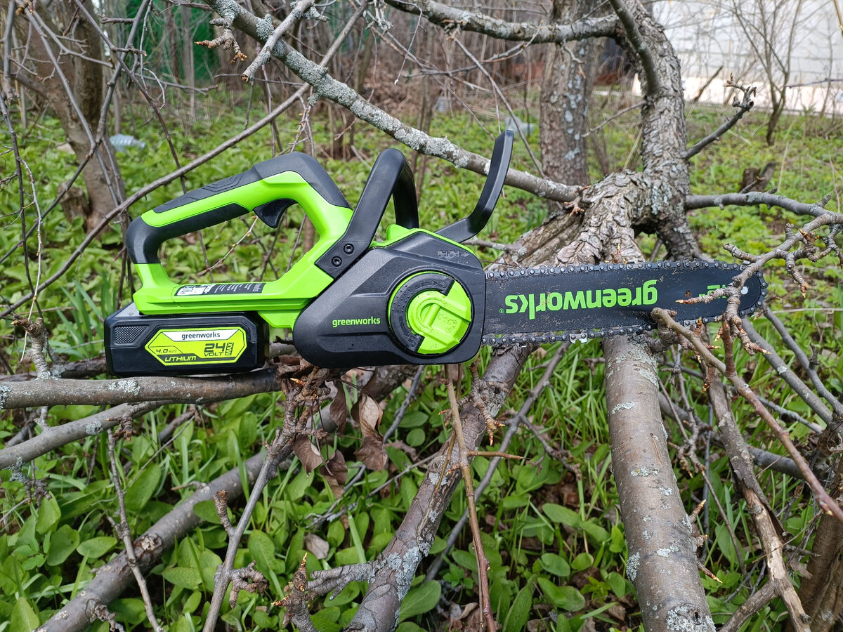 Легкая и простая Я нашла пилу, с которой может справиться любой. Она небольшая по размеру. Легкая. В полном сборе, вместе с аккумулятором она весит 4 кг. Это вам не бензопила, которую поднять не каждая женщина сможет. Это Greenworks, модель GD24CS30. И главное, что сборка и использование пилы – интуитивно понятое. Конечно, необходимо прочитать инструкцию, особенно раздел о безопасности, но сборка для меня не составила сложности. Щелк-щелк-щелк и все готово! Что еще – из-за небольших размеров пилу можно перевозить с собой, даже в моей маленькой машинке, в собранном состоянии она легко помещается в багажник. Цепь Я даже сама поняла, без подсказок со стороны, скептически наблюдавших помощников мужчин, как правильно натянуть цепь. Хотя сознаюсь, что именно этот момент при покупке меня больше всего беспокоил: «А смогу ли я сама, собрать цепь или поменять ее потом, при необходимости?» Смогу. Это просто. На корпусе есть подсказка, как правильно ее поставить, именно это мне особенно понравилос